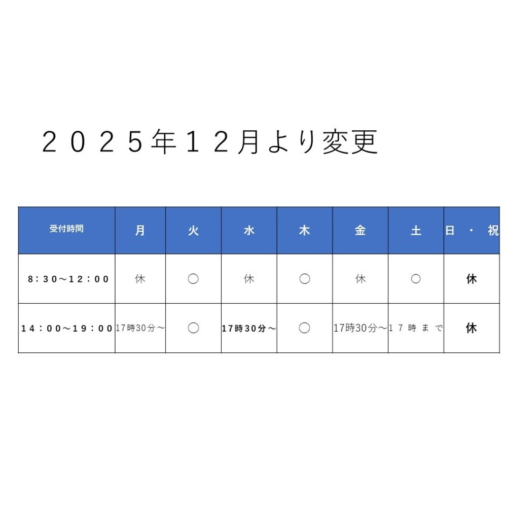 いつもかなもと整骨院をご利用いただきありがとうございます。 より良い施術をお届けするため、外部の施設でも経験を積むこととなりました。 そのため、休診日と受付体制が下記の通り変更となります。 ――――――――― 📅 営業日:火・木・土 🚫 休診日:月・水・金 ――――――――― ⏰ 営業時間 ・平日:8:30〜12:00/14:00〜19:00 ・土曜:8:30〜13:00/14:00〜17:00 ――――――――― 💡 補足 ・月・水・金は外部業務が16:30頃に終了するため、17:30以降であれば施術が可能です(事前にご連絡ください)。 ・日曜・祝日も、こちらが予定がない場合に限り《前日予約》で施術対応可能です。 ※緊急なものは当日でも対応可能な場合はご連絡ください。 皆さまにはご不便をおかけいたしますが、より高い技術でお応えできるよう努めてまいります。 今後ともよろしくお願いいたします。